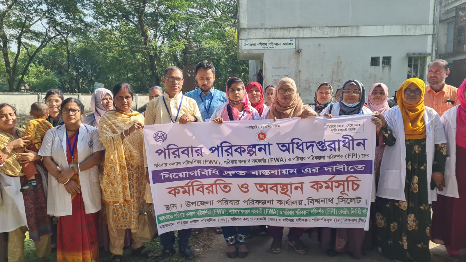 মঙ্গলবার সকাল সাড়ে ১১টার দিকে নিয়োগবিধি দ্রুত বাস্তবায়নের দাবিতে বিশ্বনাথ উপজেলা পরিবার পরিকল্পনা কার্যালয়ের সামনে অবস্থান কর্মসূচিতে অংশ নেন পরিবারকল্যাণ পরিদর্শিকা, পরিবার পরিকল্পনা পরিদর্শক ও পরিবার কল্যাণ সহকারীরা।
